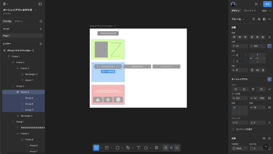 他にも、オートレイアウトにすれば位置を変える以外には縦並びのものを横並びにしたり、その逆のことやフレームに合わせた調整もすることができます。