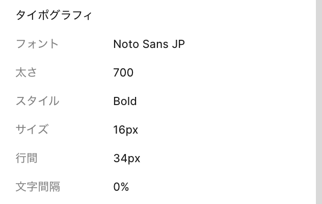 使用したフォント、フォントウェイト、スタイル、サイズなどCSSで設定する際に、必要な情報がまとめられているのでわかりやすいです!