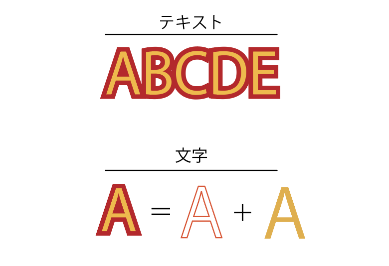 つまり、テキストは文字が集まって出来ているもので、文字は線と塗りが合わさってできたものです。